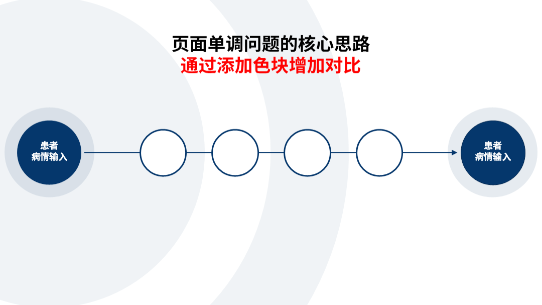 先来整体看一下这份 PPT: 对于医疗类的 PPT 呢,风格上还是比较容易把握的,颜色上选择蓝绿即可。 01 先来看一下封面页 这个页面中两个问题,一是图太模糊了,二是留给排版的空间太少了。 咋办呢?最简单的思路是,换一张新图: 从这张图可以看到,排版的空间依旧很小,而且它的构图方式属于对角线构图: 那么,对图片处理的思路是对图片抠图,只保留建筑主体,这样排版空间就变大了: 不会抠图的,可以去这个网站一键免费抠图: remove.bg 但页面太单调了,该用什么思路呢?很简单,我们可以通过 PPT 中的渐变,来模拟天空的颜色: 简单看一下页面的效果,是不是还挺干净: 只要掌握思路,3分钟搞定一张高级的 PPT 封面。 02 接下来是大段文字的排版 遇到这种页面,先别慌, PPT 排版思路的第一步呢,是先来梳理信息。 认真阅读完,会发现这里讲的是一个平台的功能介绍,能够解决两个问题: PPT 排版的目的,是为了让信息更容易理解,我们先来画一个草图: 在 PPT 中,用形状画出来,并且凸显重点: 但这时候,页面都是文字,看起来比较枯燥,所以,最后一步,加上小图标,可视化的感觉就有了: 03 然后是第三页 一张图加一段文字的 PPT 页面,该怎么排版呢?首先对于文字的部分,一定要凸显重点: 这样,页面看起来重点就会很清晰。 对于配图呢,可以找一张建筑大楼。我没有找到特别高清的配图,只有这一张: 裁剪一半,放在页面的左侧,这样一张重点清晰的 PPT 页面,就完成了: 04 最后是流程图的页面 这个页面的流程,还是挺清楚的,从输入到输出共包含6个环节,中间4个环节为智能推方的部分,因此,我们可以把6个环节,做一些视觉上的区分: 到这里呢,页面的基本逻辑关系已经清楚了,但主要问题是,太单调了。 如果你不知道怎么处理,一定要记好这个核心思路,添加色块增强对比: 最后呢,我们把文字输入进去,并且添加图标,丰富页面的可视化效果即可: 整体来看一遍: —修改前— —修改后— 掌握核心思路,30分钟搞定一份工作型 PPT ,就是那么轻松。